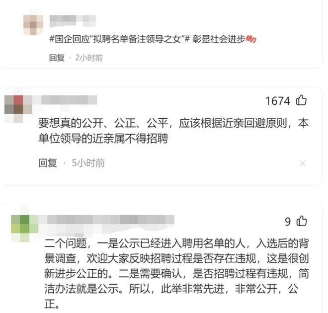 此事件引发关注后有两种不同的声音出现,一方认为国企单位敢于公开聘用者是领导干部女子身份,彰显主动接受监督的姿态,是一种进步;另一方则认为既然是领导干部的亲属,就应该有回避原则不得聘用。