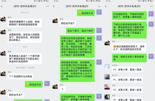 4月4号晚上,几组带CETC名称的微信群聊天截图在网上流传开来。群里有个领导语气的人指示第二天清明节的时候要有两位员工加班。