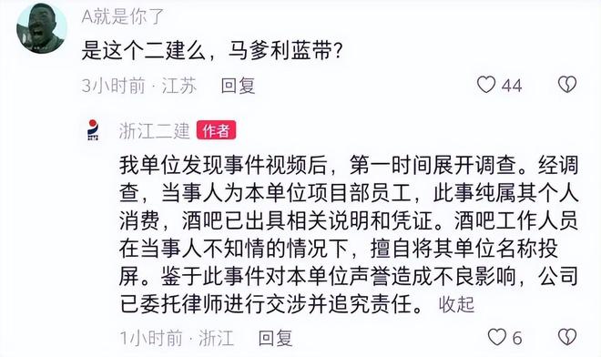 此事立刻引发热议,随后该国企在官方抖音号上回复称:当事人为本单位项目部员工,此事纯属其个人消费,酒吧已出具相关说明和凭证。酒吧工作人员在当事人不知情下,擅自将其单位名称投屏。公司已委托律师进行交涉并追究责任。