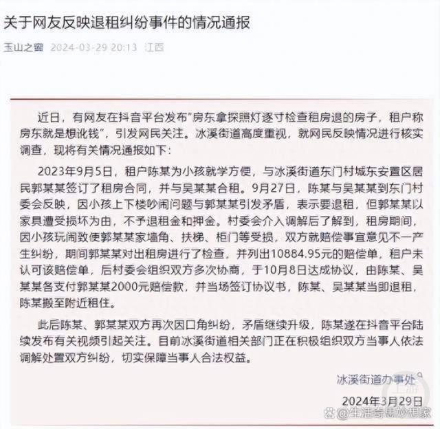 当地街道办3月29日通报中称,2023年9月,陈某(当事人陈女士)到东门村委会反映,因小孩上下楼吵闹问题,与房东郭某某引发矛盾,表示要退租,但郭某某以家具遭受损坏为由,不予退租金和押金。