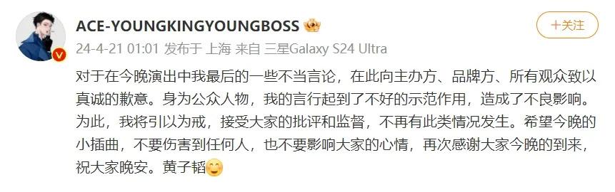 黄子韬觉得自己受到了不尊重的待遇,表示自己不认识他,也不在乎,然后骂了一句英文脏话。4 月 21 日凌晨,黄子韬在微博就自己的不正当言论道歉: