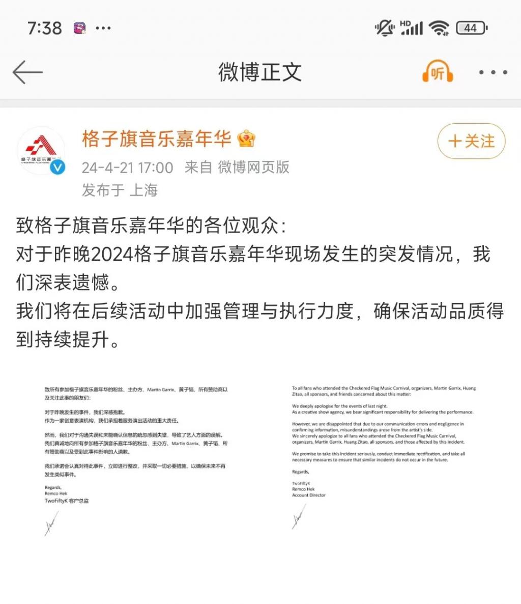 作为一家创意表演机构,我们承担着服务演出活动的重大责任。然而,我们对于沟通失误和未能确认信息的疏忽感到失望,导致了艺人方面的误解。我们真诚地向所有参加格子旗音乐嘉年华的粉丝、主办方、Martin Garrix、黄子韬、所有赞助商以及受到此事件影响的人道歉。我们承诺会认真对待此事件,立即进行整改,并采取一切必要措施,以确保未来不再发生类似事件。