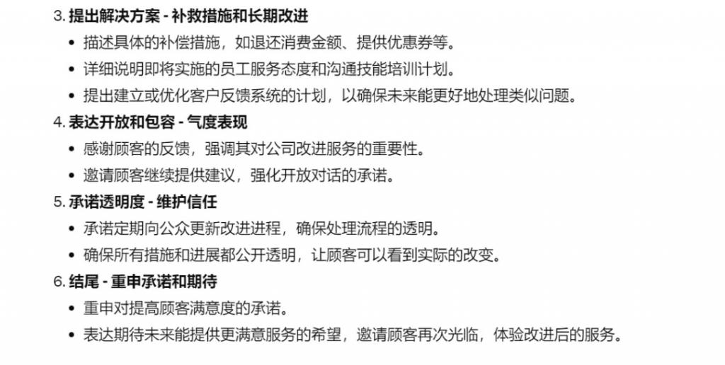 5、明确提出解决问题的措施和承诺,同时界定这些承诺的可行性和责任范围,避免过度承诺引起的后续责任问题。