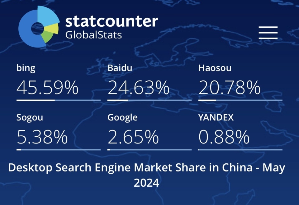 Bing:45.59%,Baidu:24.63%,Haoso:20.78%,Google:2.65%,YANDEX:0.88%,Sogou:5.38%
