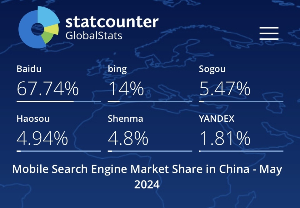 Baidu:67.74%,Bing:14%,YANDEX:1.81%,Sogou:5.47%,Shenma:4.8%,Haosou:4.94%