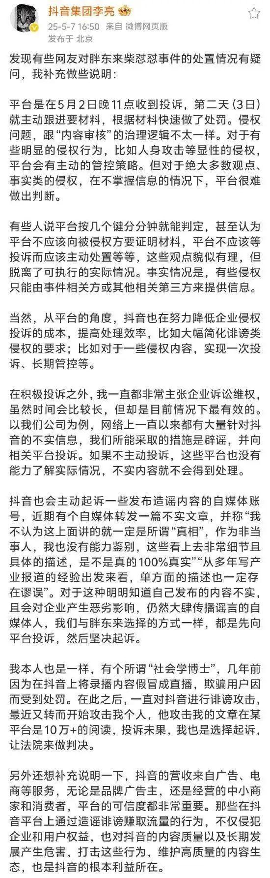 这件事本来也不应该闹大,但爆发点在于:抖音平台“出手”慢了。被于东来抓住了“诉委屈”的机会。