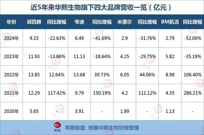 尤其是从业绩上,来自披露的财报数据显示,2024年,曾经的两大“10亿营收”品牌润百颜和夸迪,均已跌破10亿元/年。同时,BM肌活品牌的营收也“腰斩”。